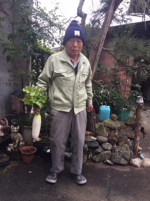 夏は色とりどりの、冬は大根を・・。暑い日も寒い日も一生懸命、畑仕事に精が出る。あまりにも寒いのではと思い、この冬、父子に帽子を送ったら、大変気に入ってくださったようで、この写真はその帽子と大根とご本人。あまりにいい写真で、何度見ても笑みがこぼれ、いつまでもお元気で。と、つい声をかけてしまう。