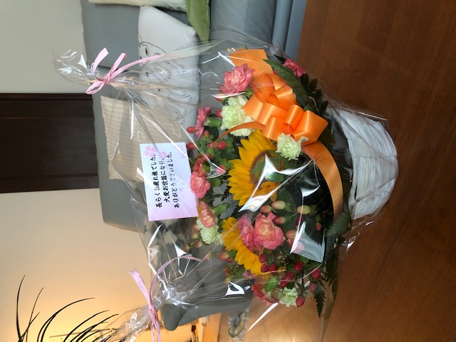 と書いていたら、花が届いたようで、喜びのメッセージとお花の画像が入った。