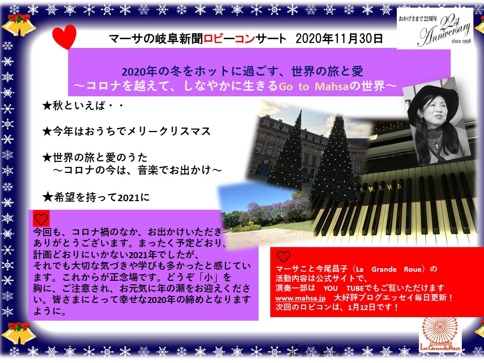2020年最後の演奏会になる予定ですので、心を込めて、楽しい12月が過ごせるように、そして心身共に健やかな2021年に向かえるように、演奏いたします。