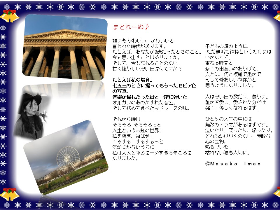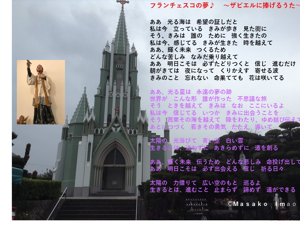 季節を彩る日本の懐かしい曲から、クリスマスソングメドレー、世界の旅と愛の歌をオリジナルメドレーで、そしてオリジナル曲は久しぶりに、「まどれーぬ」と12月3日に旅立ったザビエルへの思いを込めて、「フランチェスコの夢」