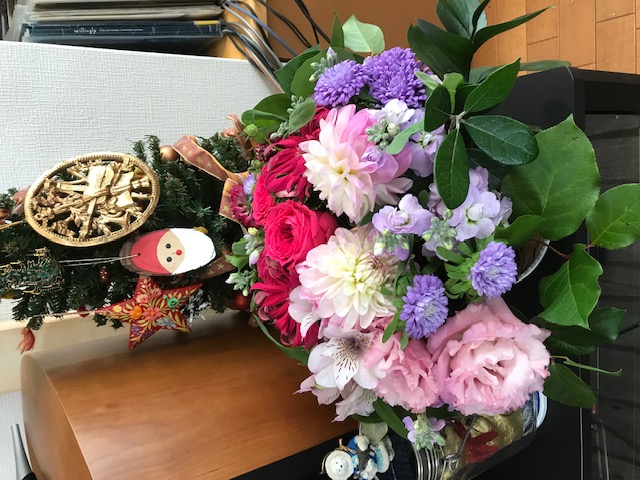 素敵な色合いのお花のアレンジメントが今年も届き、思わず、本当はコロナさえなければ、行っていたはずのパリのクリスマスオーナメントを付けてみる。