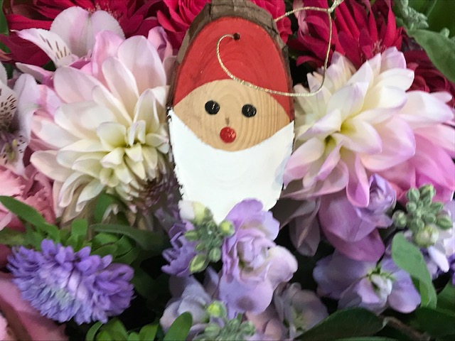 これは、まさしく1年前の12月3日。ルーブル宮内にみつけた観覧車が立つ、移動遊園地の中で求めたものだ。このサンタくんは、フランスの地方の作家さんの木を使ったユニークなアートだ。このサンタくんと目があって、日本まで連れて帰り、ずっと1年間、私のそばにいてくれた。いただいたお花にとても似合う。