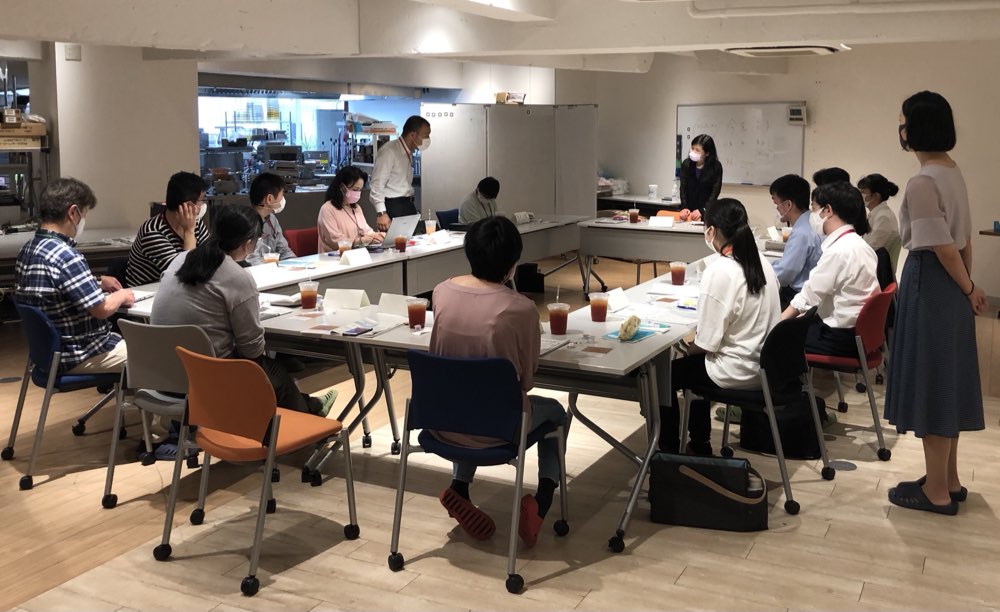 今回はもちろんコロナ対策もしっかり、ゆったり空間で。初めての開催ということで、観覧車の話(ハッピーコミュニケーション)をしながら、私のことを知っていただく。次に、自分のことを伝える「名札づくり」。相手に呼んでほしい名前を書いて、名札にする。そして発表。皆さん真剣に取り組み、しかも相手の話をよく聞かれる。笑いや、拍手も。会場はあたたかい雰囲気に包まれる。マスクをしているが、皆さんの目がキラキラして、身を乗り出しているのがよくわかる。