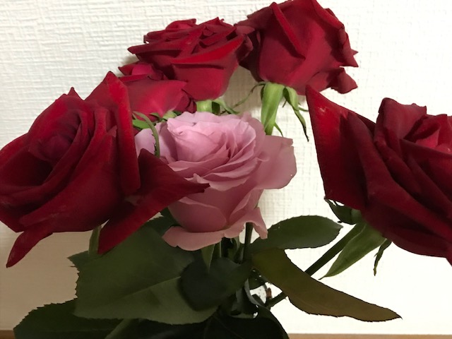 赤いバラの中の一輪のピンク。情熱のなかに、ほんのり優しさがにじんでいる。