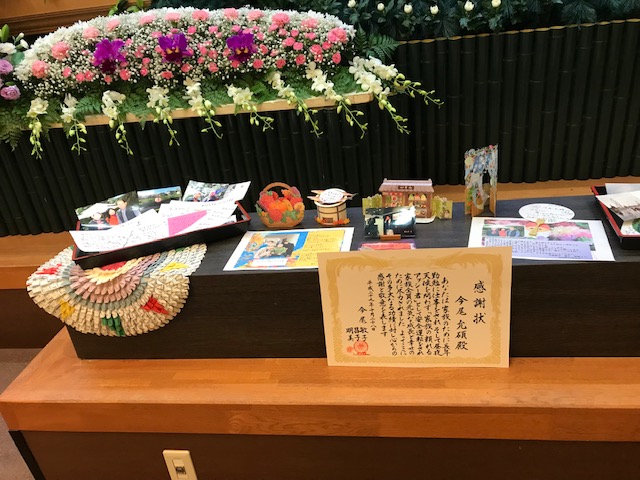 家族での思い出の品々・・。父が愛用していた帽子をはじめ、免許返納した年の誕生日に渡した感謝状、夫婦の元気な頃のツーショット写真、たいそう喜んでくれた岐阜新聞に寄稿した記事本、この1年間に父に書いた手紙などなど・・・。そして、実家の庭に咲いていたオレンジのコスモスを当日の朝、妹に摘んできてもらって、それも納めた。