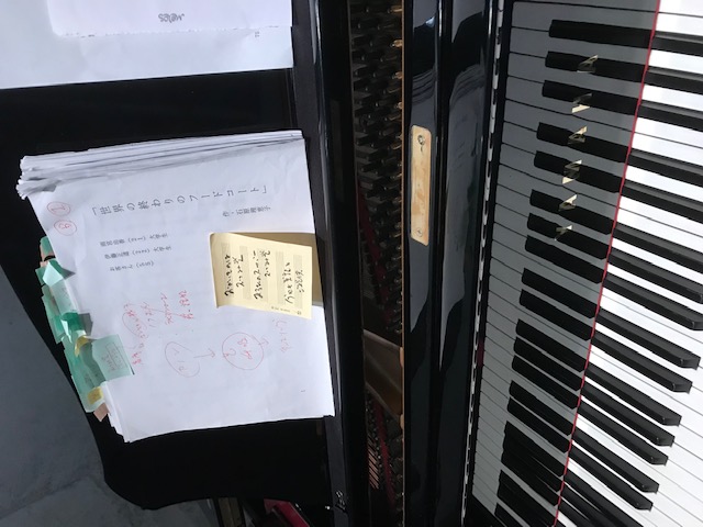 出演者の皆さん、本番の様子、そして、演奏のタイミングのチェックを入れた付箋付きの台本とピアノ。さまざまな写真からこの3日間をふりかえり、安堵。