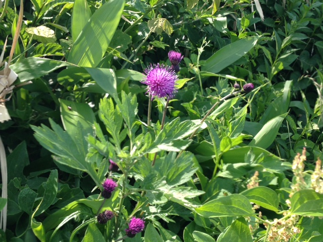 地元の酒屋さんが教えてくれた草村の中の北国街道を歩き、日本海とあざみに歓迎され、朝の活力を得る。