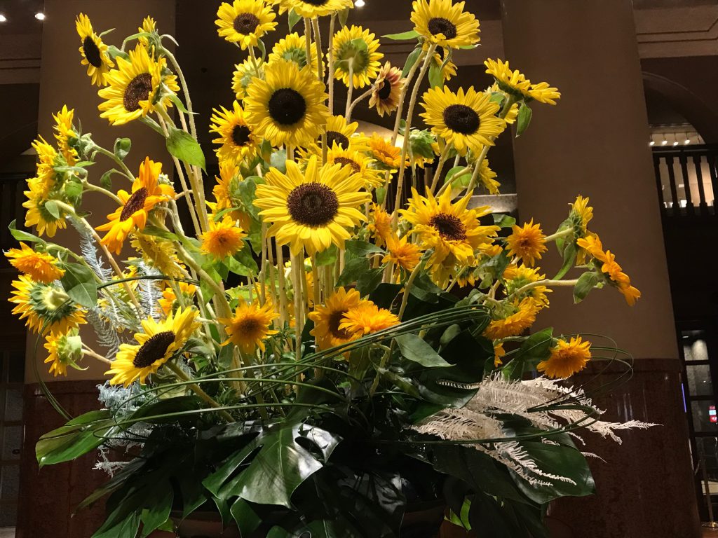 美容院でご挨拶をして、帰りに隣のホテルのロビーを通ったら、ひまわりが