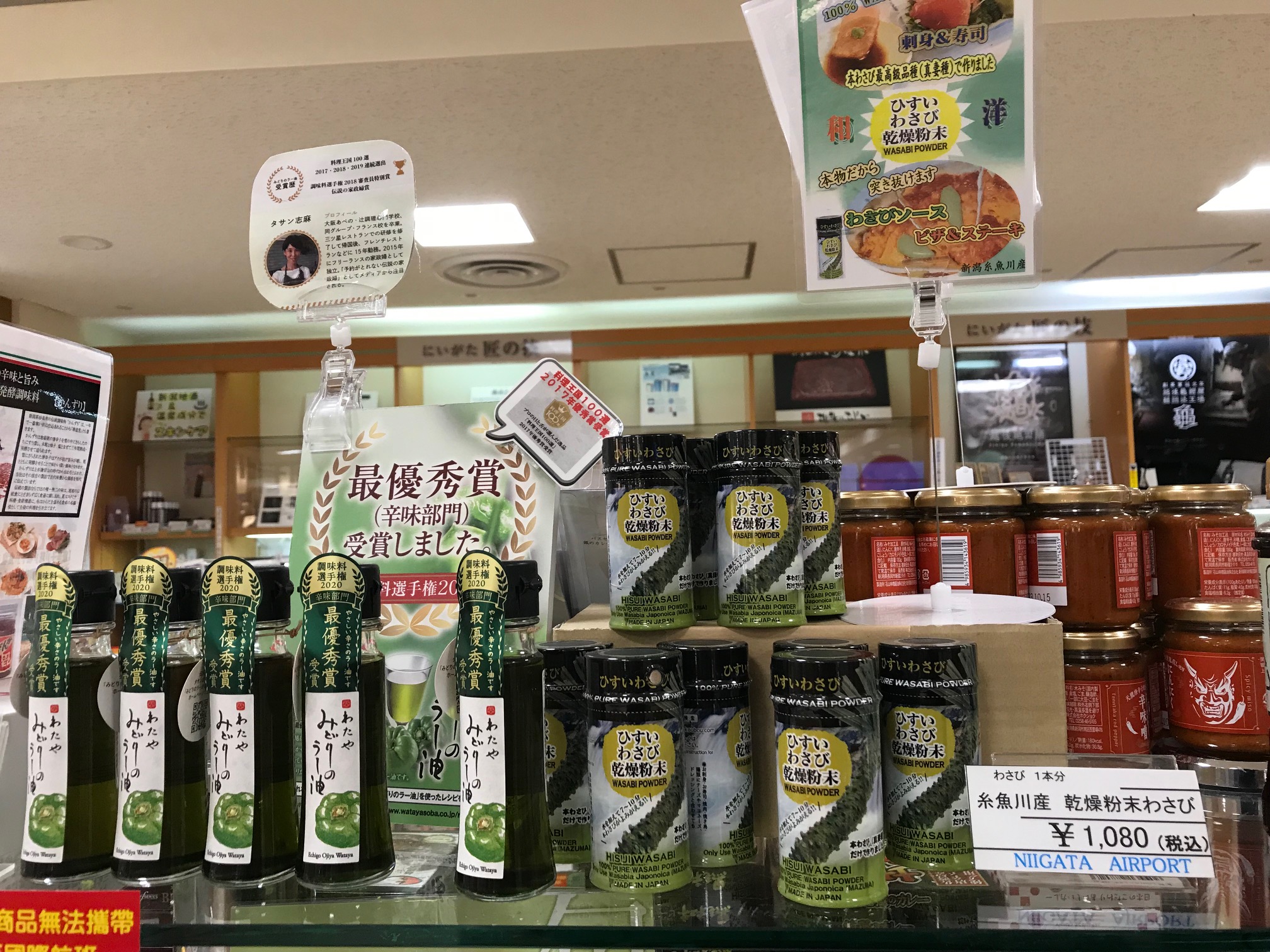 いずれも地元の素材を使ったもの。粉のワサビは、糸魚川の建設会社の新規事業ではじまったワサビ栽培から誕生した商品のひとつ。みどりのラー油は小千谷の蕎麦屋さんの画期的な商品。