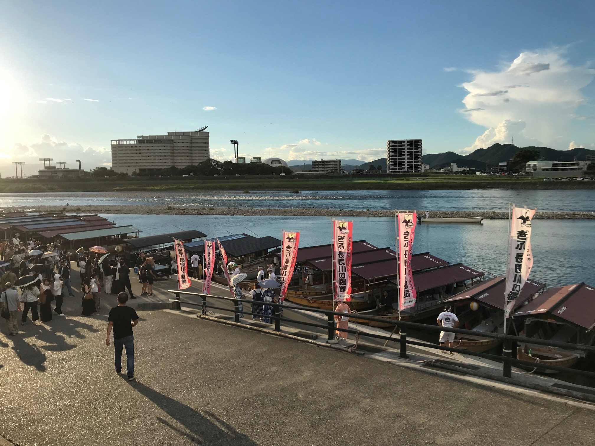 平和な景色に出会った。鵜飼い船に人々が乗っていく様子。天気も良い。奥は清流長良川。流れも今日は穏やかに見える。夕方18時。まだまだ明るい。西日が水面に写り込んでいる。