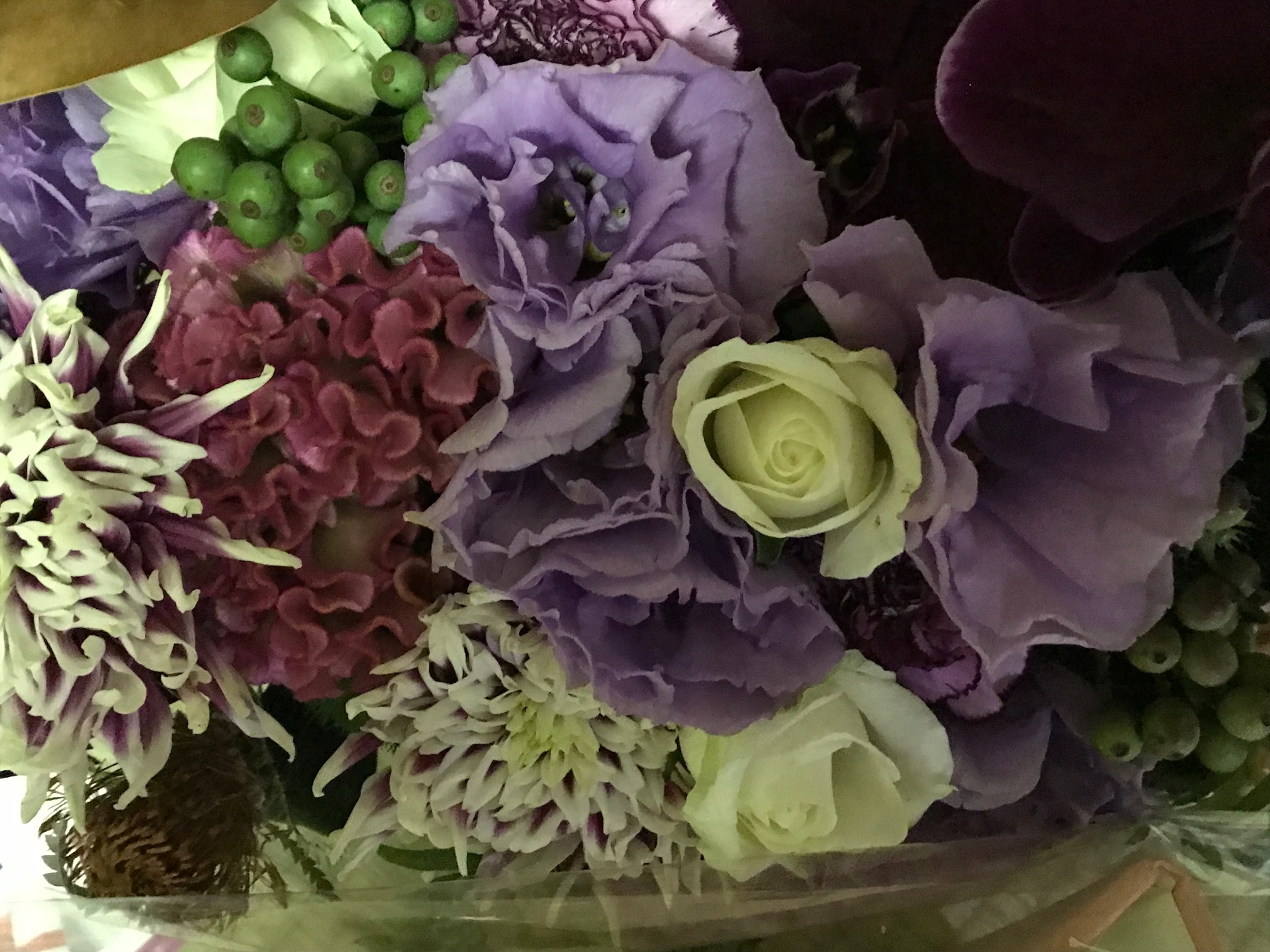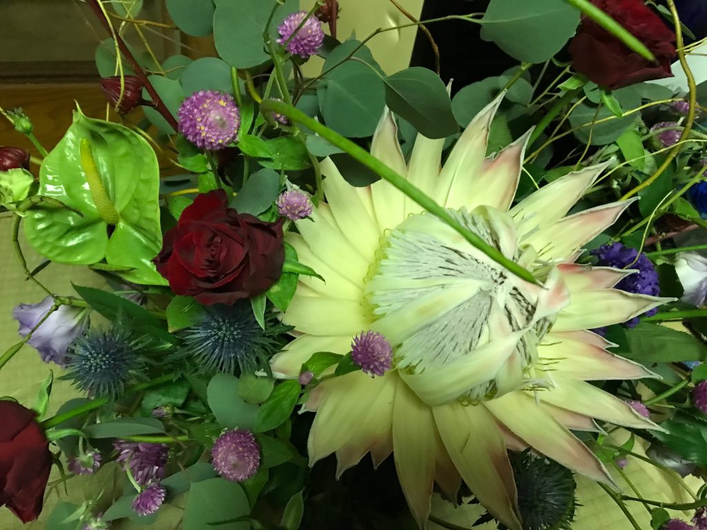 そのなかの、お花がギュッとつまった豪華なアレンジメントと珍しい大きな花が入った作品。いずれも両手で抱えきれないほど大きな作品。これは父母に見せてあげたいとずっと