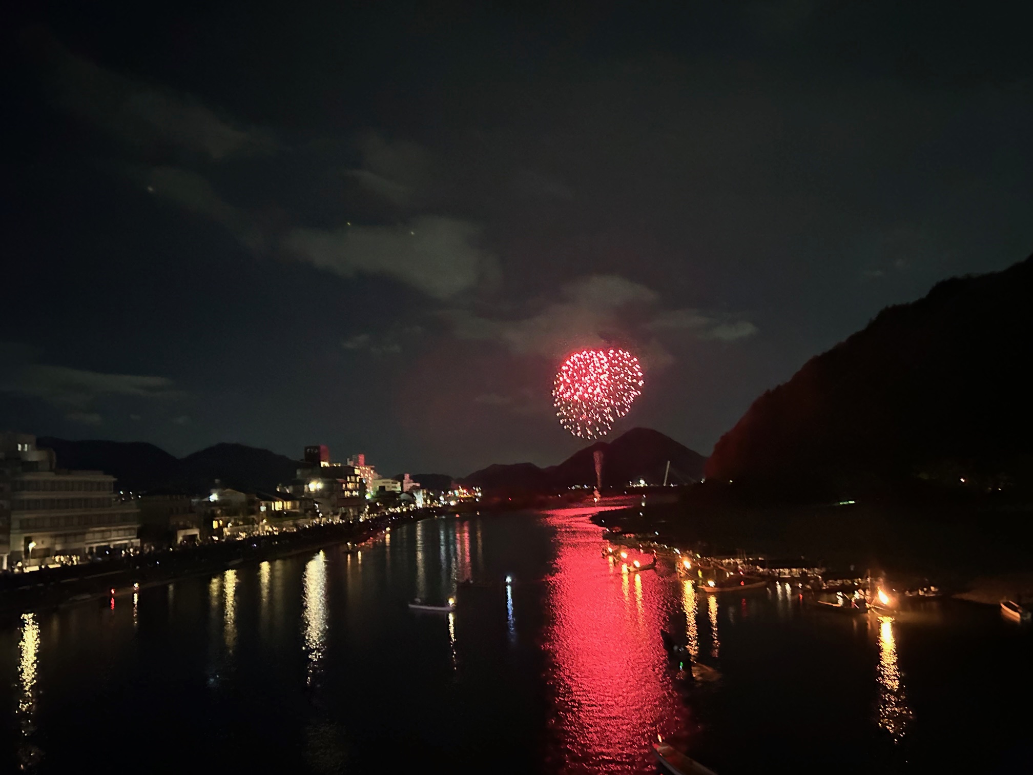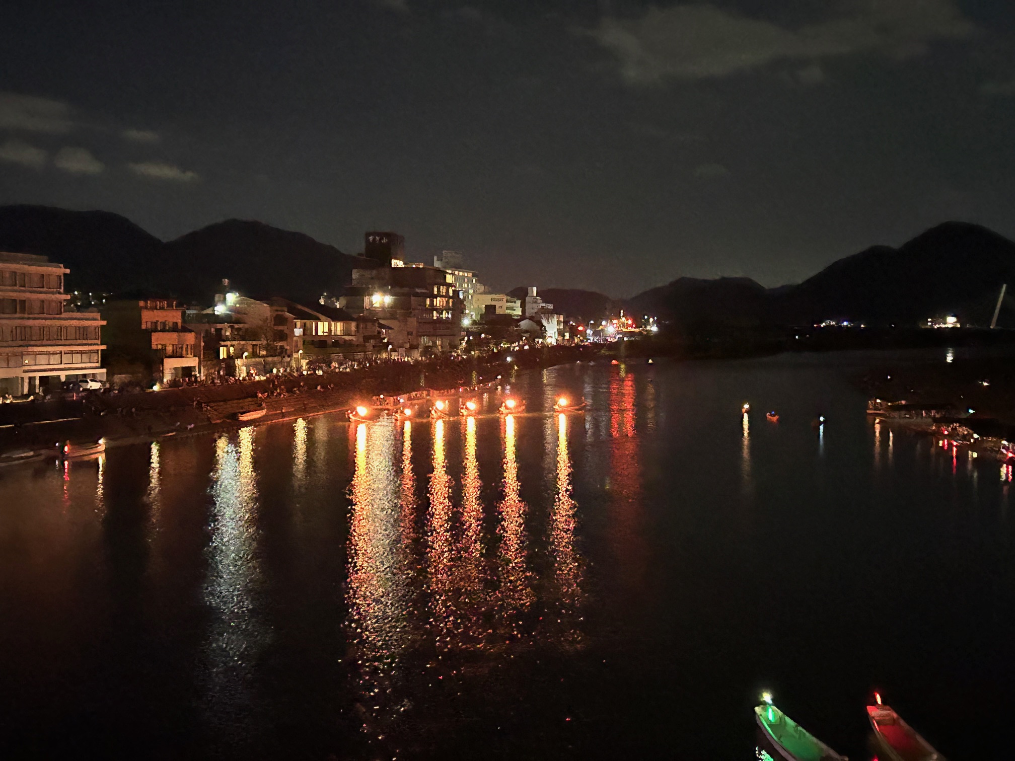 初日は花火もあがって、大変ドラマチックな夜空と水面の祭典を楽しめる。