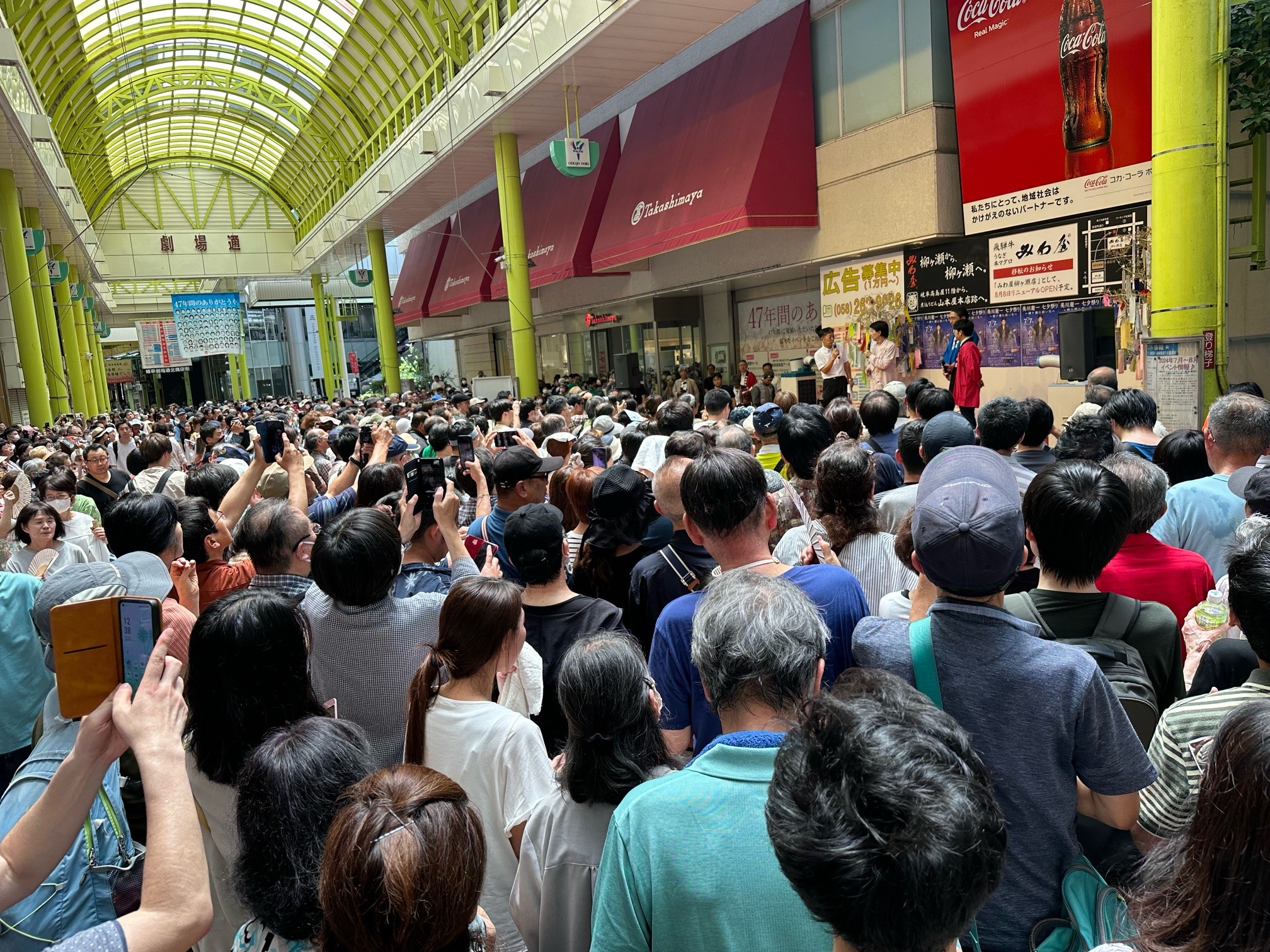 「柳ケ瀬ブルース」という昭和を代表するヒット曲で、この商店街を盛り上げてくれた美川憲一さんが来岐。このデパート閉店の前に、町を盛り上げようと出演されたステージ前の様子だ。