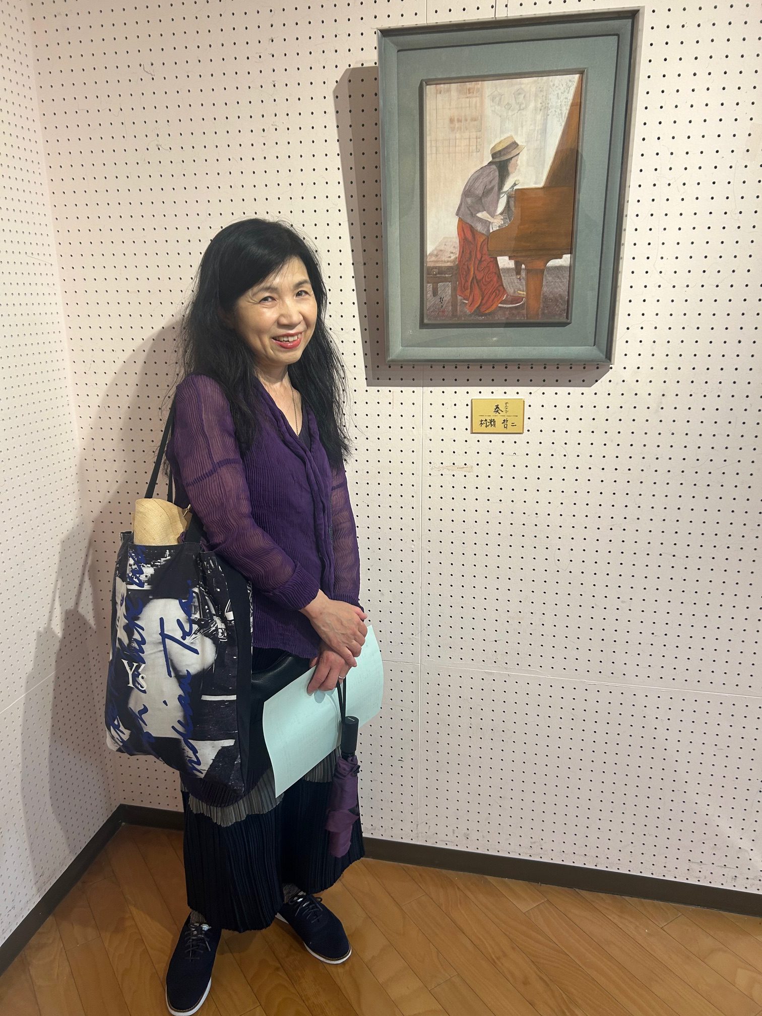 作家さんは、この柳ケ瀬商店街にある八百屋さんの店主、村瀬さん。実はまだ絵を習い始めて2年目とのことであるが、視点といい緻密な描写といい、配色といい、お見事な出来栄え。私の演奏を見ながら、どんな構図でどう描こうかと考え、制作に着手。すでに半年ほど前に出来上がっており、しばらくお店に飾ってあったが、今回はお仲間たちとの展覧会に出展ということで、外でのお披露目は初。