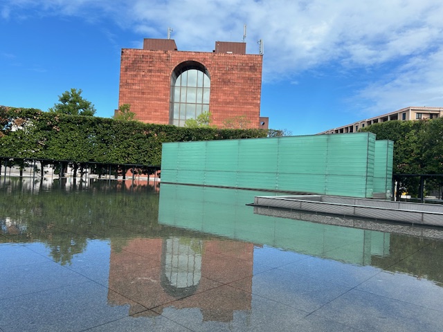 昼間はこのような姿で、空や近隣の景色を映し出しているが、夜になると、光ファイバーにより1945年に死没された方の数(約7万)の灯りがともるそう。