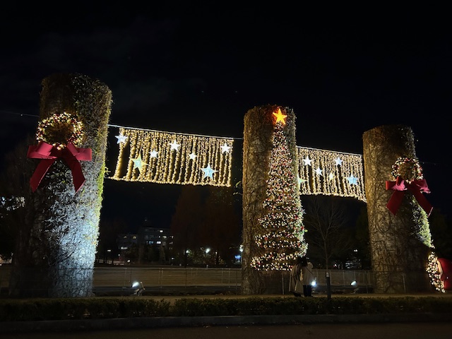 写真は、近くにある企業の敷地内公園に輝くクリスマスイルミネーション。