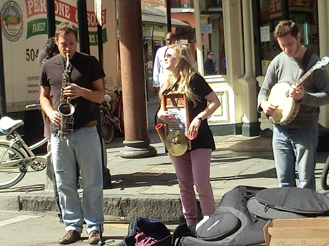 写真は、ニューオーリンズのバーボンストリートか。路上で演奏するミュージシャンが