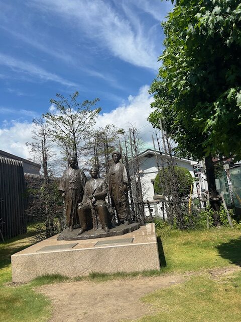 この記念館の向かいに立っている孫文と梅屋夫妻の銅像。