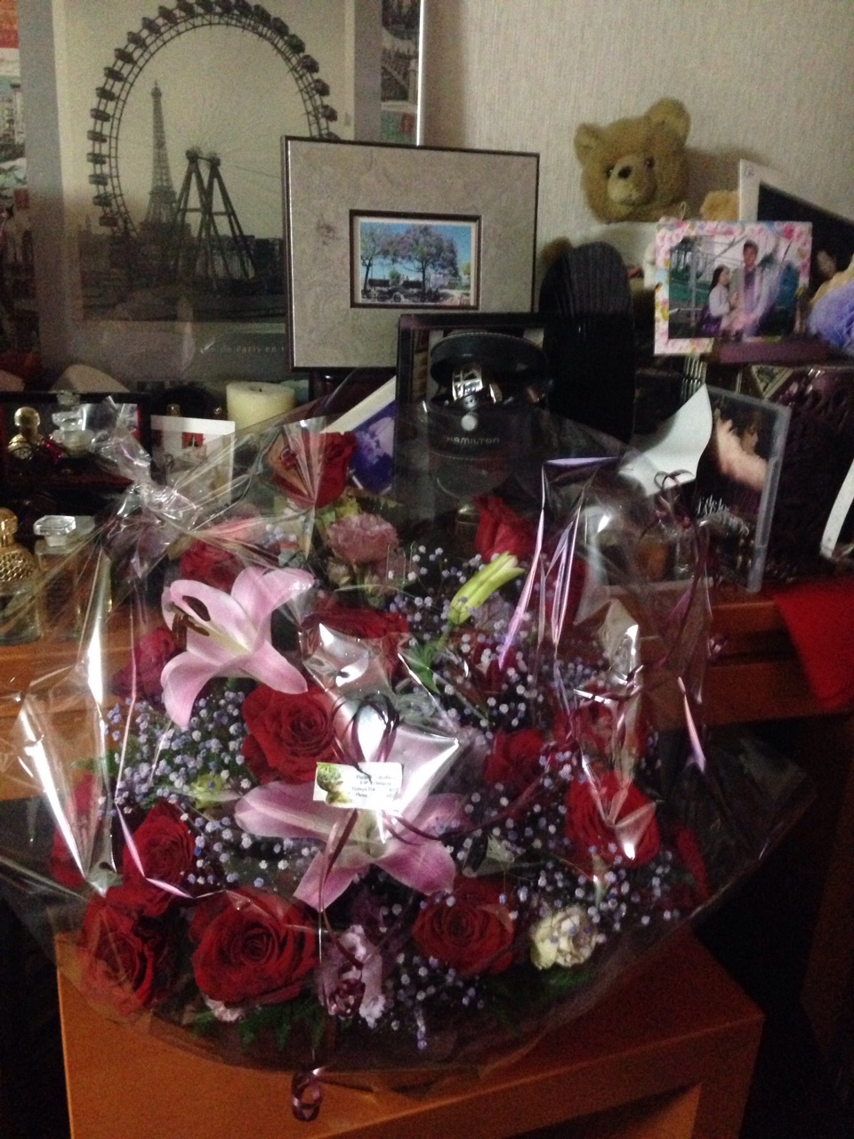 今年はバラの花は18本。それに紫のカスミソウや大きなユリも織り交ぜられ、