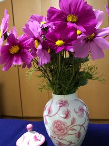 ちなみに、今週は濃いピンクのコスモスと先日のライブでいただいたお花を飾っている。