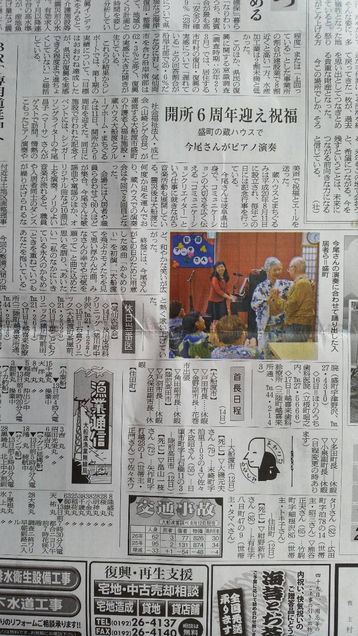 さる8月11日のチャリティ演奏のことが、大船渡の地元紙「東海新報」に掲載されました。直接取材を受けませんでしたが、若手の記者さんが会場で熱心に取材してくださっていたのが印象的でした。 改めて、大船渡のみなさん、東北のみなさんのお元気!お祈りしております。